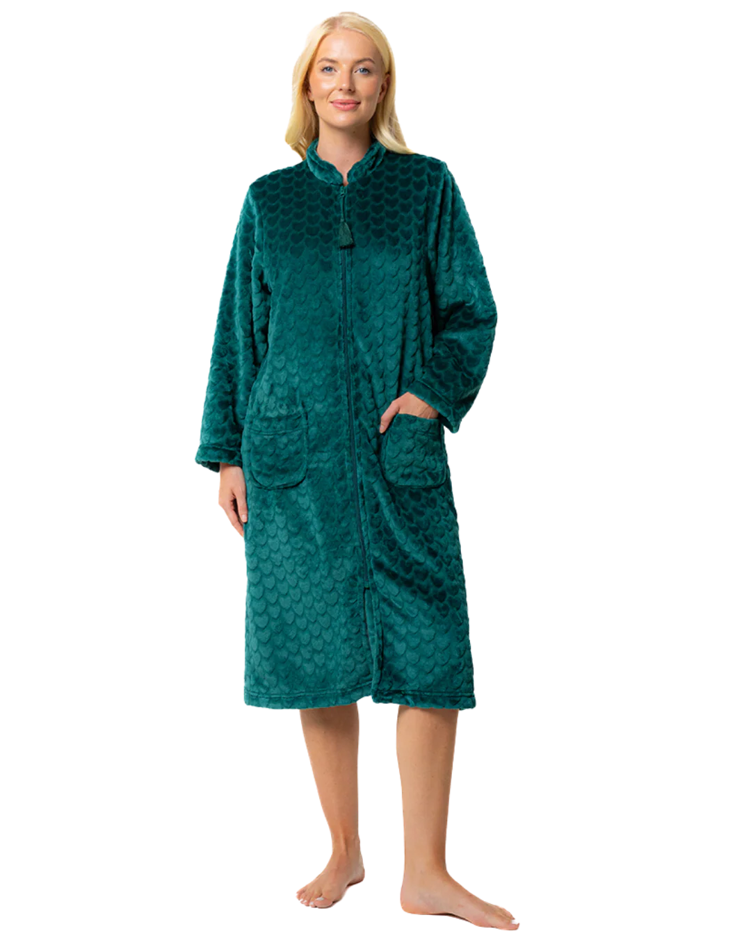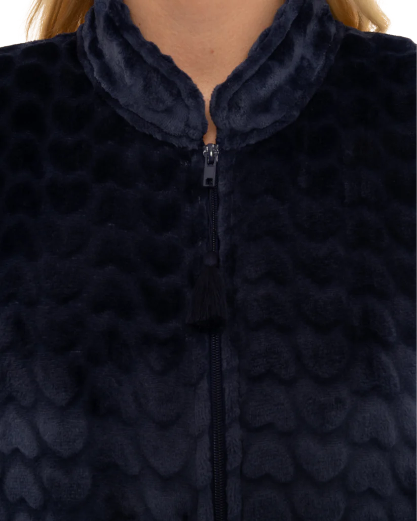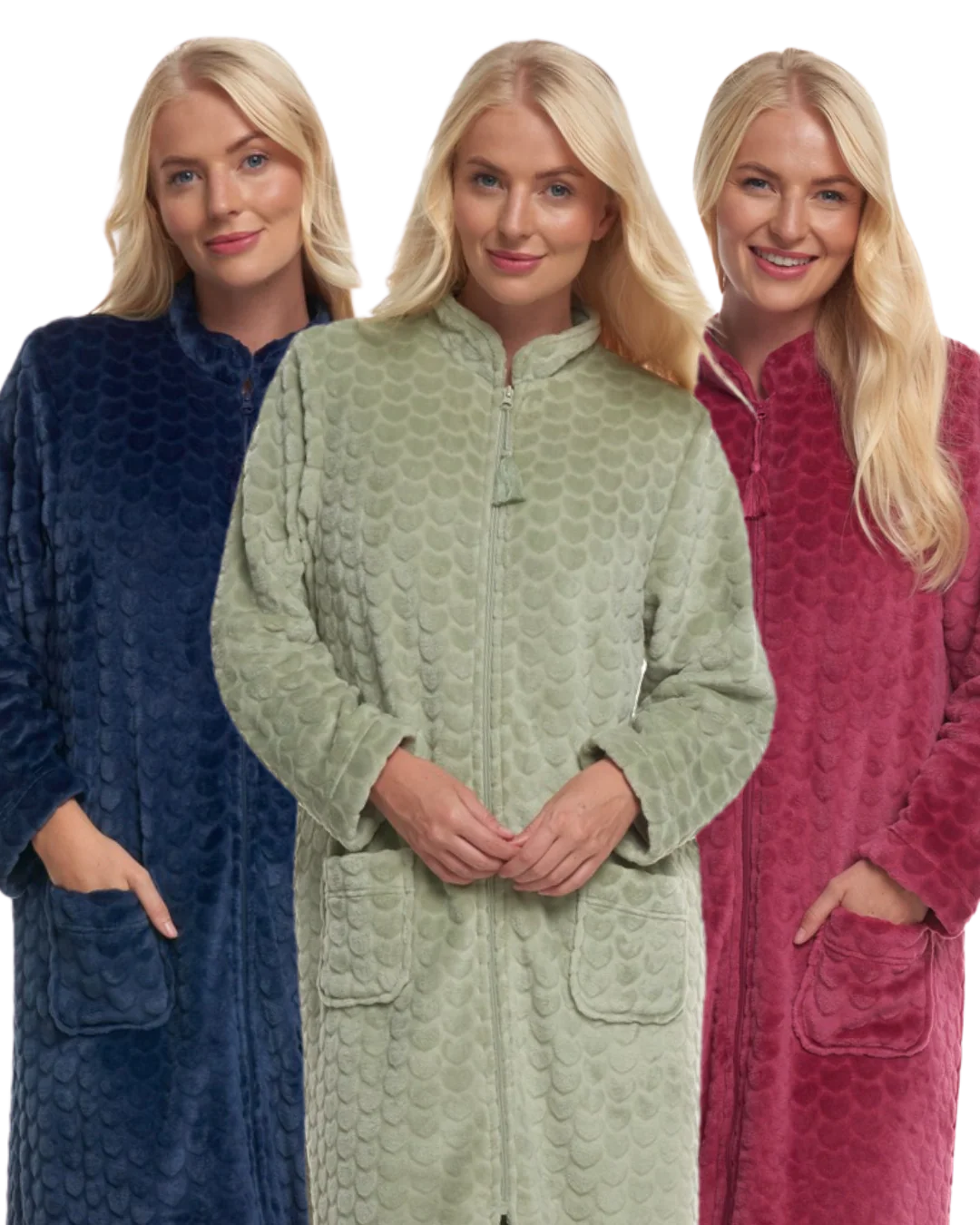 This ladies' zip-up dressing gown is made from plush, heart-embossed fleece fabric in a choice of rich Sea Blue, Wine and Navy The fabric manages to be both lightweight and wonderfully cosy, having all the warmth of a thicker more cumbersome dressing gown. The long-sleeve gown features a warm, cosy stand-up collar and two patch pockets.